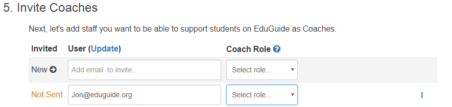 Enter your colleague’s email address into the field in the “User” column, and then use the dropdown menu under “Coach Role” to select the role that you would like them to fill on the team. Your choices will be Admin Coach, Captain, Lead Coach and Support Coach. You can read a description of these team coach roles here.
