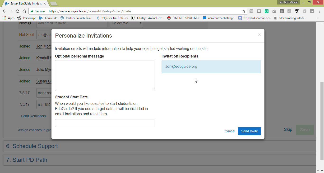 When you are ready, click “Save” to submit the email addresses and role assignments that you’ve entered in. A modal will appear where you will be able to send a personal message and enter a student start date.